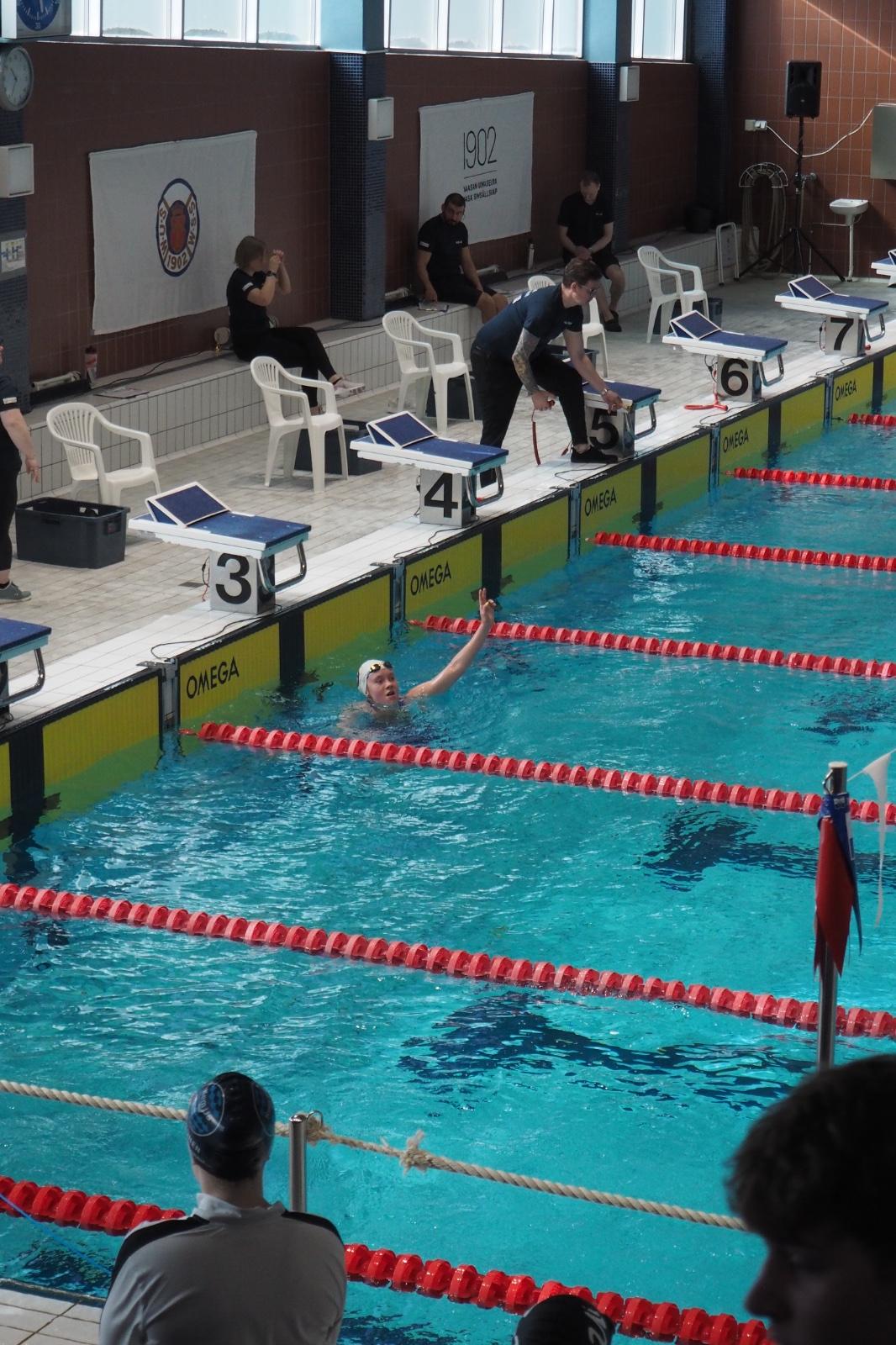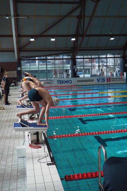 Sunnuntaina saimme onneksi nukkua hieman pidempään, eikä kilpailupäivä ollut aivan lauantain mittainen. Altaassa sama ilotulitus kuitenkin jatkui. Viimeisissä lajeissa osalla alkoi jo näkyä viikonlopun rasitus, mutta jokainen lähti silti hyvällä asenteella ja tsempillä myös viimeisiin startteihin.